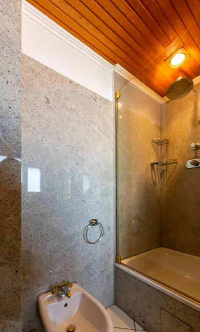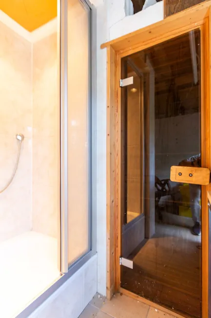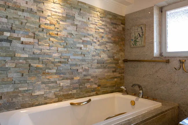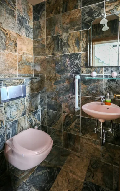 In der Küche und im Badezimmer ist ein Steinfliesenbelag verlegt.