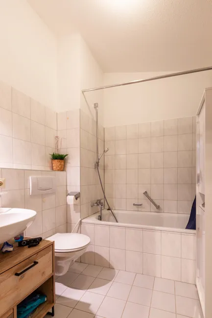 Das helle und freundlich gestaltete Badezimmer ist mit einer Badewanne ausgestattet.